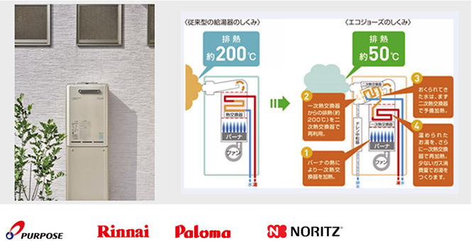 さらに、新型の給湯器『エコジョーズ』なら排気を有効利用する為(給湯効率95%)、環境にも優しく、ガスの使用量を抑えることができます。