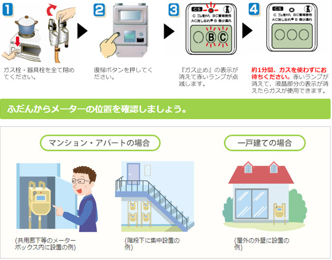 ガスメーター復帰操作 ガスメーターはガス漏れやガスの消し忘れ、地震等の異常を検知した場合に、自動でガスを遮断する機能を備えています。 ガスが遮断した場合、下記の手順に従って復帰操作を行うことで遮断状態は解除されます。 ガス漏れの場合は復帰操作を行っても遮断状態は解除されませんので、当社までご連絡ください。 都市ガス用メーターの復帰操作 プロパン用メーターの復帰操作